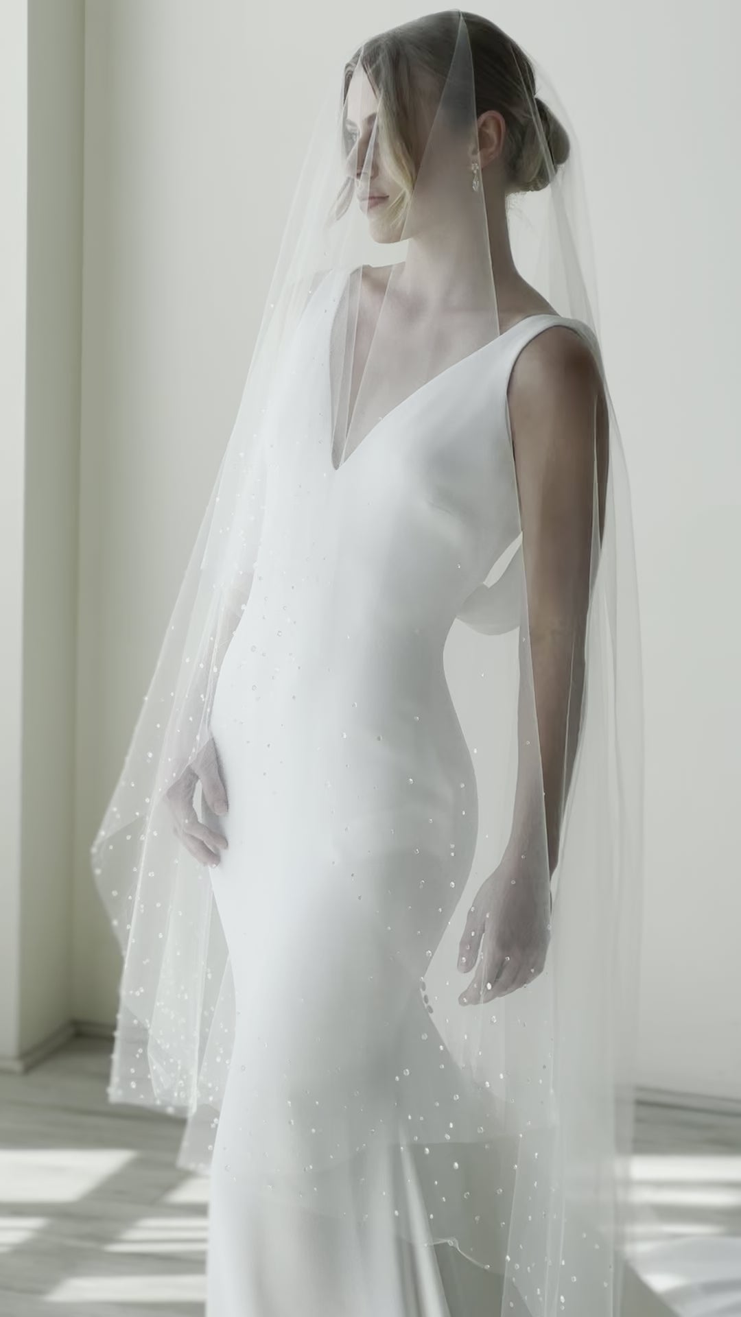 Velo inspirado en Sofia Richie. Este velo Dew Drop te hará brillar en tu día especial. Combinando la elegancia de un velo clásico con la declaración única del borde de gota de rocío fruncido que se estrecha, este velo está adornado con gotas de rocío de varios tamaños para una apariencia glamorosa. Su sofisticación y exclusividad le garantizarán una impresión inolvidable.