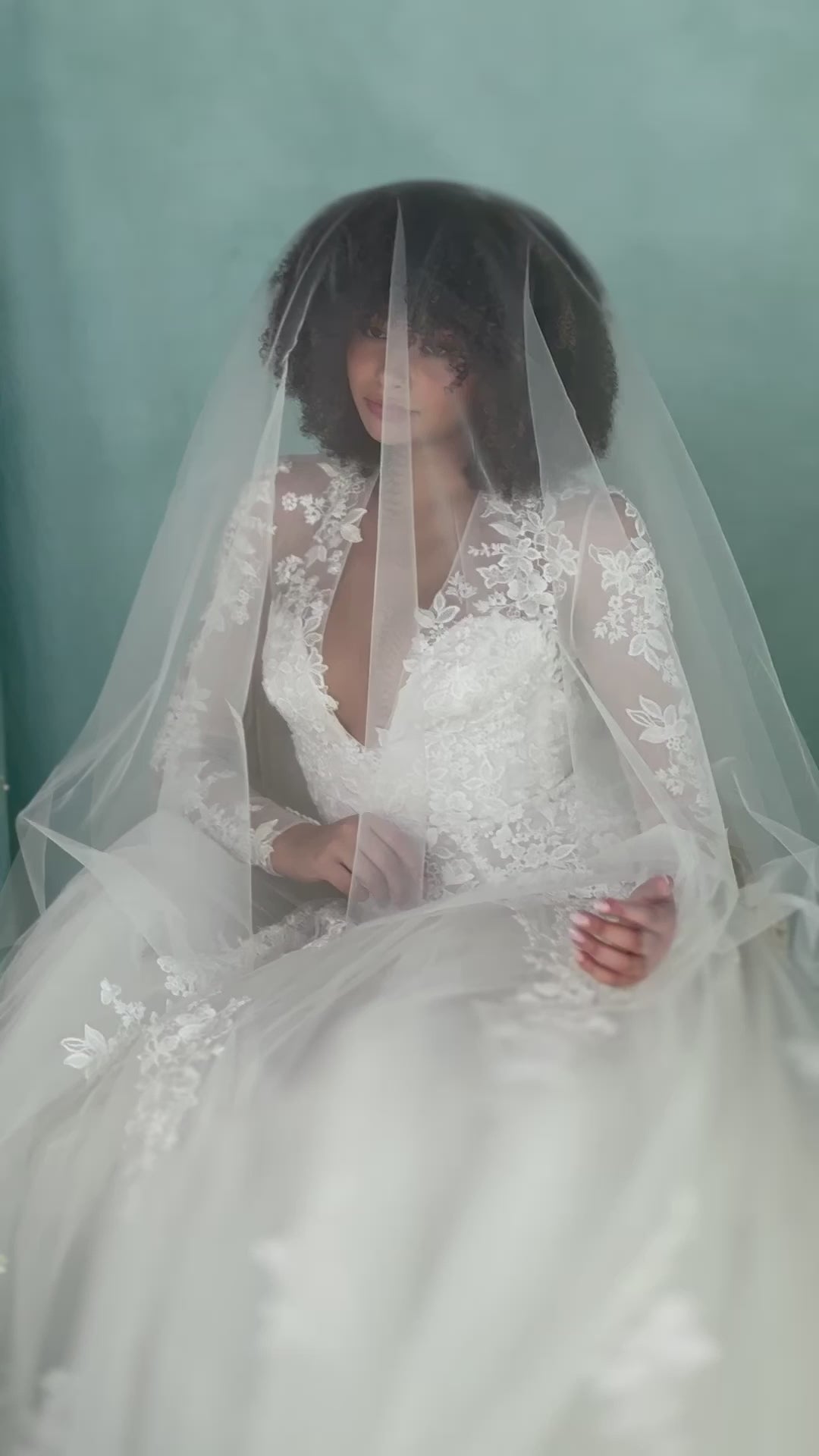 Indulge in the luxurious craftsmanship of this French soft tulle wedding veil, complete with a polished cut edge and expertly attached to a wire comb. Enhance your bridal ensemble with this elegant and sophisticated accessory.